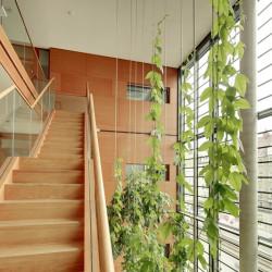 Der Natur-Fokus beeinflußt auch das Gesamtkonzept für den verglasten, dreistöckigen Indoorgarden: Abstraktion der Natur mit dem Ziel, eine besondere Art des legeren Besprechungsraumes zu kreieren. So ist der Indoorgarden vollkommen holzverkleidet, Pflanzentröge gliedern den 3-stöckigen Raum und schaffen Rückzugs- und Entspannungsorte im Grünen.