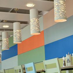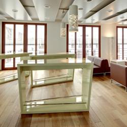 Die Sky-Bar mit grandiosem Blick über die Gleise funktioniert nach dem Vorbild einer italienischen Bar, mit 3 Kassen und einer langen offenen Showküche als Bartresen. Die dominierenden Materialien sind hier Holz (Eiche, natur im Zusammenspiel mit Räuchereiche/ farbig lackierte Holzstühle), Bistro-Kacheln und Leder (Sitzbänke). Die Räuchereiche steht entweder für „Loungebereich“ oder „Podest“. Der Eßbereich vermittelt seinen mediterranen Charakter über die sonnigen Farben der lackierten Stühle (limette-grün, hellblau) in Kombination mit den Akustikpanelen, die auch die CI-Farben (FTI) enthalten.