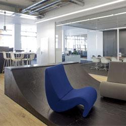 Ist eine Werbeagentur mit Sitz in München, die Idee war in den neuen Räumen die Herkunft oder den Ursprung deutlich zu machen. Der Creativchef stammt aus dem Snowboard- und Skaterbereich, so ist gleich im Eingangsbereich eine vertikale Halfpipe zu erkennen, die zu einer auf dem Boden liegenden Halfpipe führt. Im Hintergrund befindet sich ein hinterleuchtetes Bild, inspiriert von den Werken von Jeff Wall sollte es auch eine Geschichte über die Agentur erzählen.