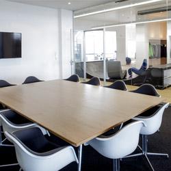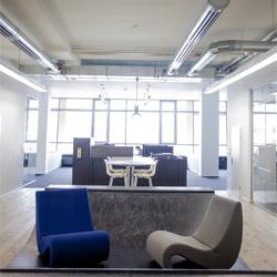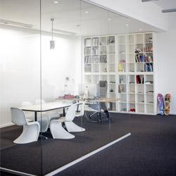 Die Büroraume sind, bis auf die Räume der drei Geschäftsführer, der Konferenzraum und die Büroküche, alles verglaste Bereiche, als open space organisiert, wobei der Creativdirektor ein halboffenes Büro hat und somit noch direkter mit den Teams in Kontakt steht und sich jederzeit mit diesen austauschen kann.