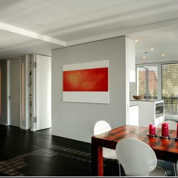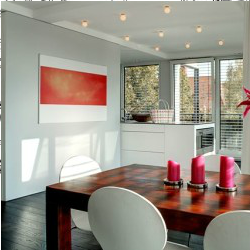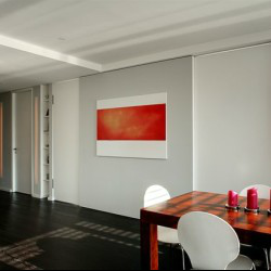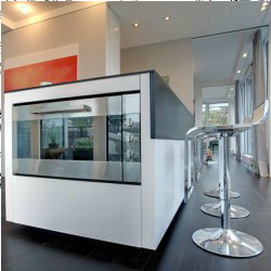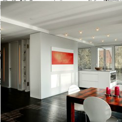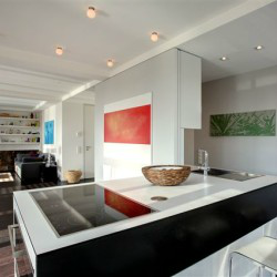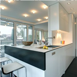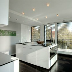 Diese Träger ermöglichen es, das gesamte Penthouse durch einen innenarchitektonischen Coup aufzuwerten und mit einer neuen Flexibilität völlig neue Licht- und Sichtachsen zu schaffen. So läßt sich in der maßgeschneiderten, mobilen Küche die gesamte Küchenwand - inklusive Schränken und Kühlschrank - mit einem Handgriff um 90° drehen, da sie an einer Achse zwischen Träger und Boden befestigt ist. Funktional erreicht man so zwei unterschiedliche Küchentypologien, einerseits die geräumige, abgeschlossene Wohnküche, andererseits die raumeffiziente „Frankfurter“ Küche, die den Raum zum Wohnzimmer hin öffnet und zu einem Großraum macht.