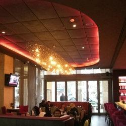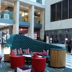 The lobby is defined by the green corner couches, both being exclusively produced from Behncke’s drafts. Besides being a seating area, both sides of these couches are also used for demonstration purposes and exhibition space. As a place of communication, they invite to sojourn and due to their size they offer a protected area within the high lobby. The “huge sofa interior” design by the artist Pippilotti Rist was the inspiration for playing with the proportions of the couches. Both their style and coloring are based on the first big luxury cars. The elegant color dark green gray gives these radical asymmetric shapes back its balance. A lamp, four meters high, hovers above it all. It was designed by Behncke exclusively for the InterContinental Düsseldorf hotel and is inspired by the mobiles from Alexander Calder (1898-1976), a sculptor from the USA. Although hovering lightly and playfully with its eight separate light sources, the lamp still adds a defined upper border to the lobby.