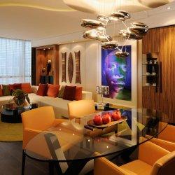 The main idea of the current draft being realized is a rolling wall incorporating all other functions within a spiral. Integrated into these rolling walls are display cabinets showing artistic African sculptures in the bedroom as well as the dining room. The rolling wall is built to contrast the otherwise business-oriented style of the hotel: the curved line as a symbol for the “casual” life, effortlessness and relaxation. Due to its floating shape it fits perfectly into the spa area. Going this way, one passes the large terrace with its expanse of water and the quiet area, a room with a view. A large, ivory colored couch area (designed by Patricia Urquiola) combined with red-orange pillows stands for the “lounge character” of the living room. Tables, closets and carpets for the rest of the living area were designed exclusively. Earth and green tones dominate, connecting color-wise to the green on the terrace and creating the feeling to actually be outdoors.